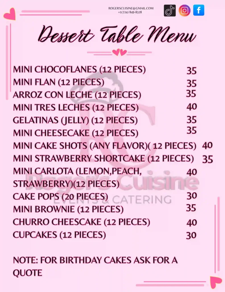 Call us to place your order, From elegant cakes and cupcakes to specialty Latin treats, Rogers Cuisine makes every event sweeter. Order through Clover and pick up fresh at our food truck in Viola Building, Cranberry Township, PA.